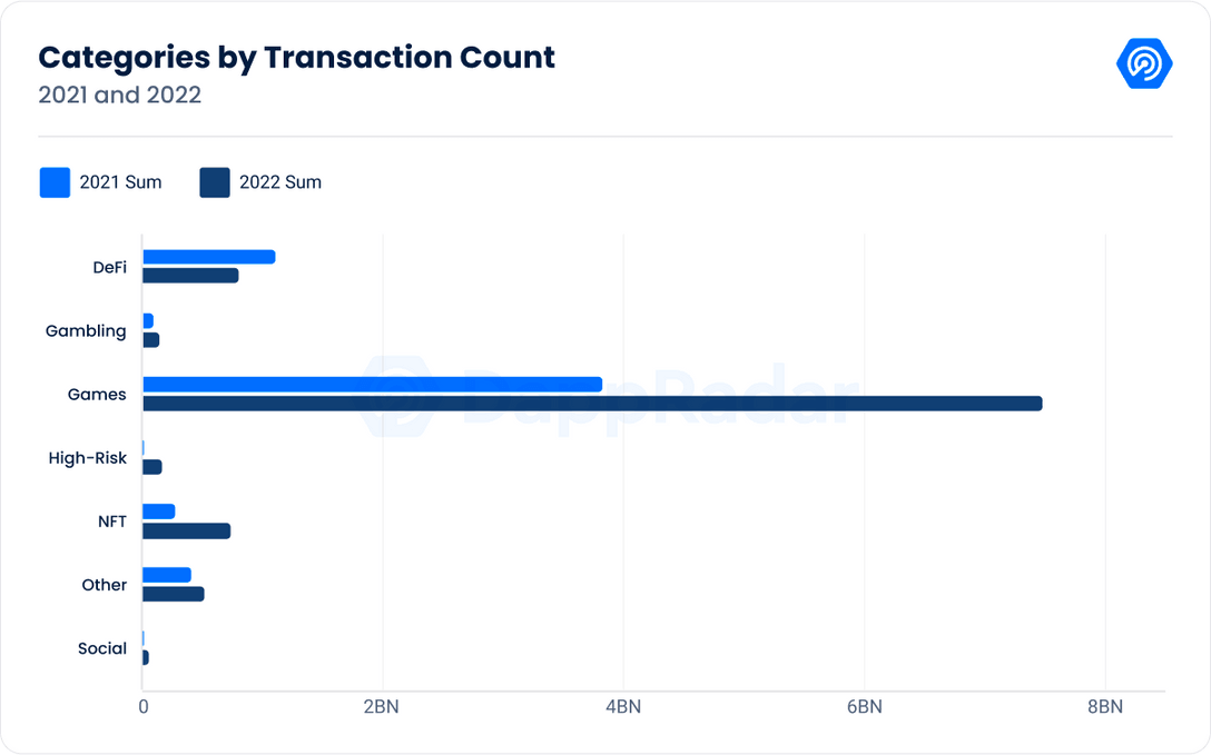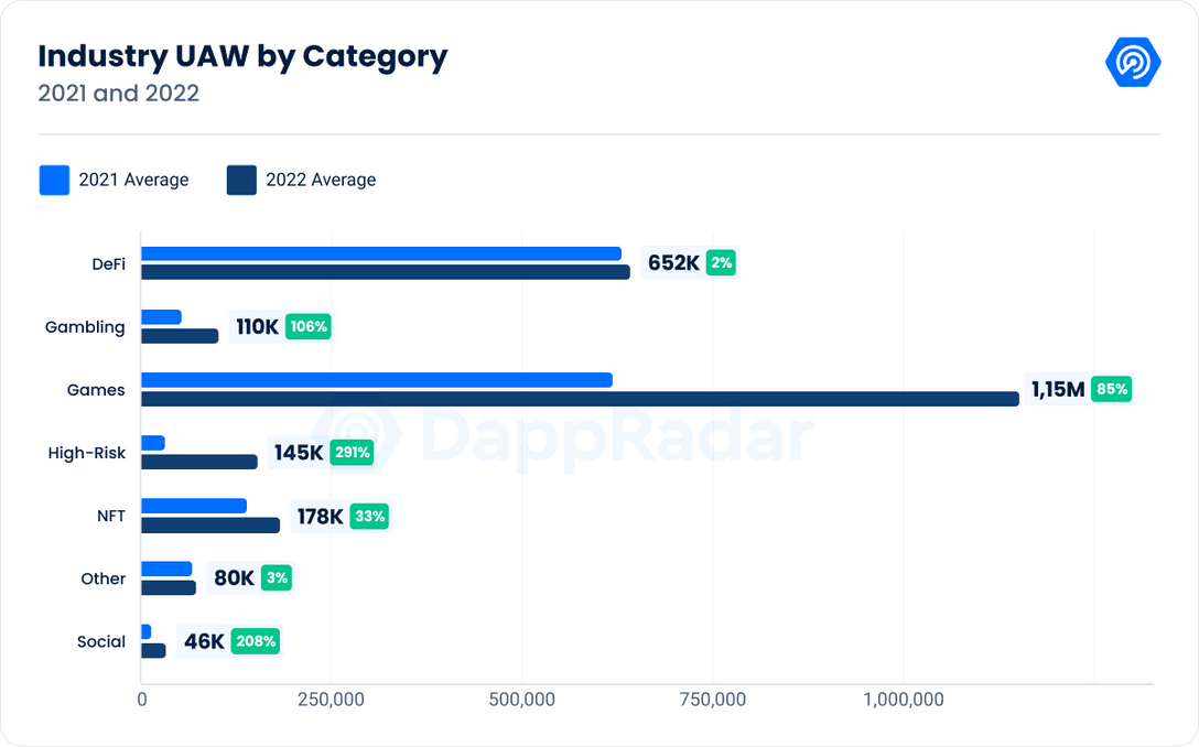 In 2021 DeFi was the leading use of blockchains. This year, it has been overtaken by gaming, with 49% of wallet activity attributed to gaming. Not only that, gaming has grown by 85% to 1.15 million unique active wallets.