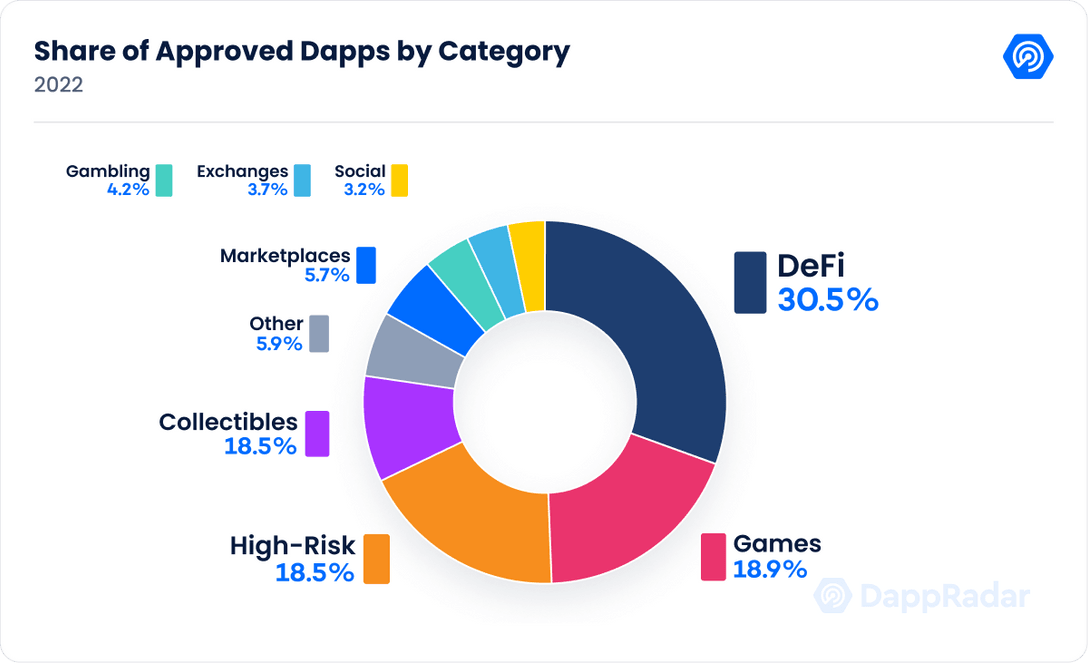 Clearly, DeFi apps are still leading in the share of dapps being created and approved by DappRadar.