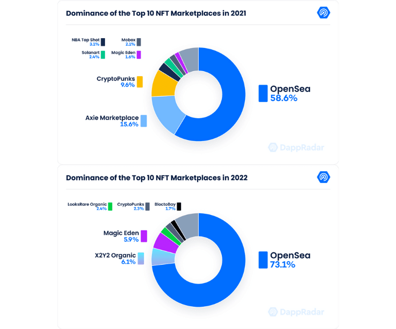 2022 saw the rise of NFT marketplaces following the explosion of NFTs in 2021. We saw new players like LooksRare, X2Y2, GameStop, SudoSwap and more get into the NFT game to mount a challenge on OpenSea. Yet Opensea grew its dominance.