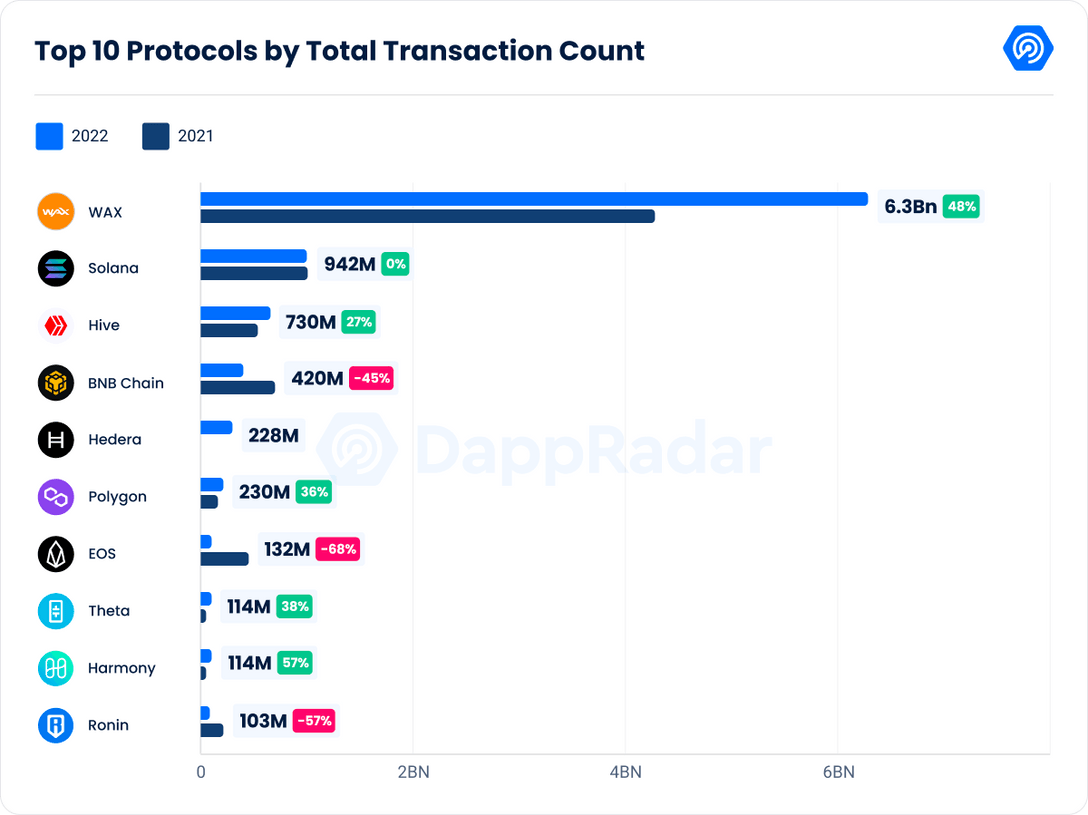 The chain dedicated to NFTs and Web3 gaming, WAX, led by a massive margin in the number of transactions. Solana came up next although with negligible growth in total transactions.