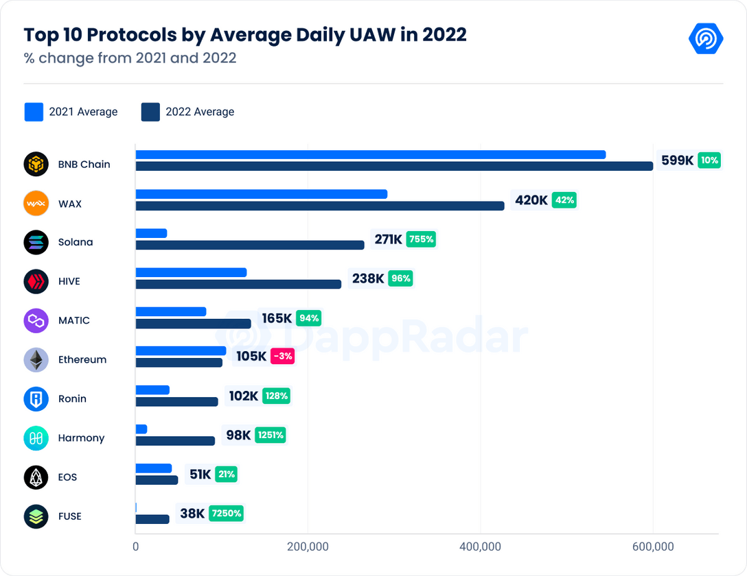 BNB chain retained its crown as the most popular protocol with 599K DUAW interacting with it on average. Solana, Harmony and Fuse saw huge growth in their ecosystems.