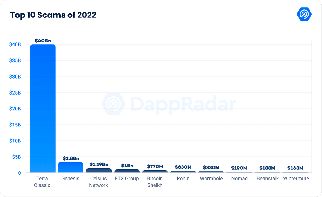 Terra Luna took the lead on the biggest failure. It's hard to beat a $40B exploit. Lootbringer suffered on this one too 😢. Then the other 2 musketeers (Genesis and Celcius) and the night king (FTX).