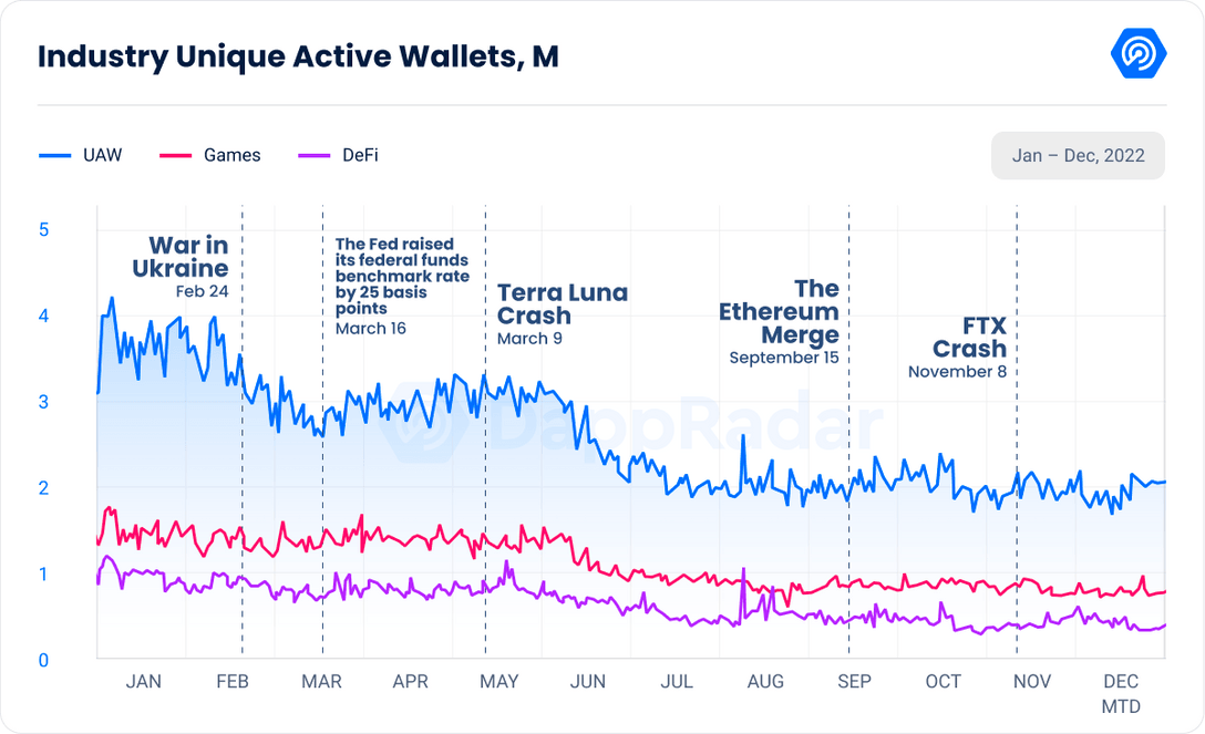 This year was rough for the crypto markets, with several major events causing pressure on financial performance. These effects also affected the usage of blockchains over the course of the year as we saw declines in daily unique active wallets (DAUW).