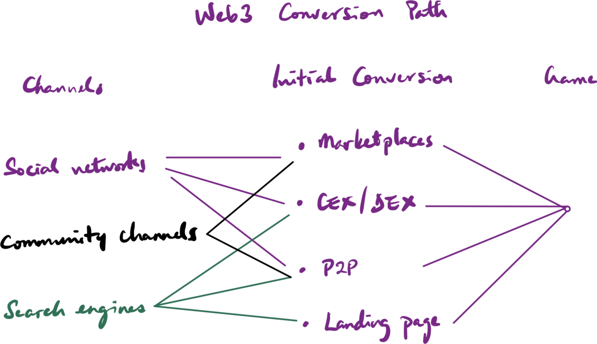 Web3 breaks this frame, making the conversion path very different. Users can mint your NFTs on your website, P2P (a direct exchange) or a marketplace like OpenSea. They could buy your token off a centralized exchange like Coinbase or Binance, or they could get it on a DEX like Uniswap. All this is done before getting into your game.