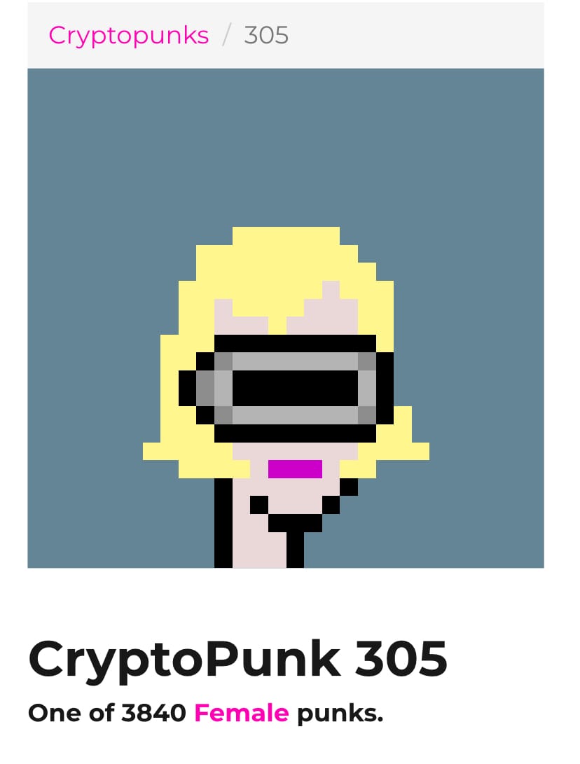 Why this punk? According to an article by Decrypt, Punk #305 was chosen in part because its number corresponds to one of Miami’s phone area codes: 305. Miami is also the hometown of two of Yuga’s co-founders, Wylie Aronow and Greg Solano.
